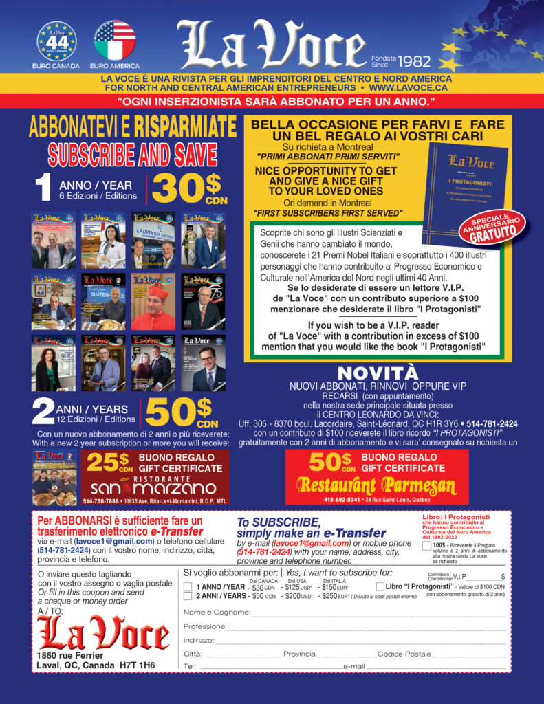 Esaltiamo il loro contributo dando ampio spazio alle nuove opportunità imprenditoriali, la finanza e la politica per gli italiani all’estero riuscendo così a promuovere il turismo e l’export dei prodotti italiani in Canada e USA.